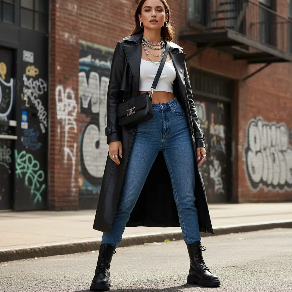 Try a leather trench coat outfit with a cropped top, high-waisted jeans, and combat boots. Add silver jewelry and a mini crossbody for a bold streetwear aesthetic.