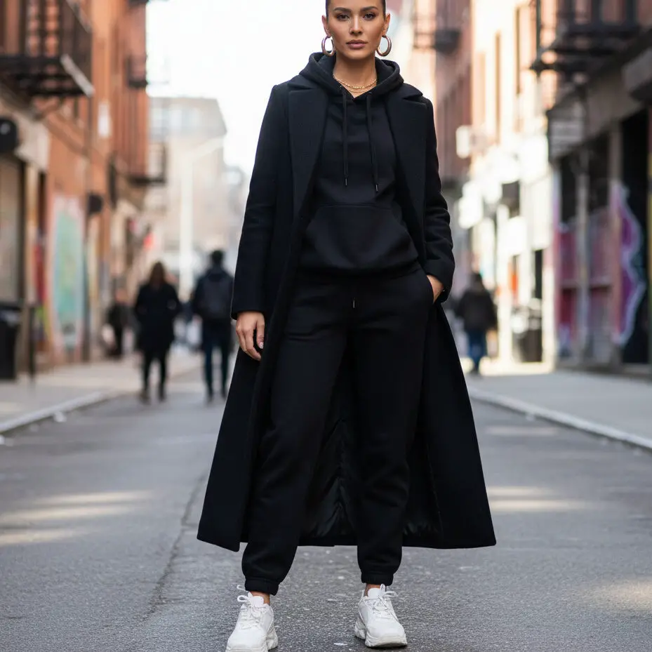 Pair a black overcoat outfit, a hoodie, and white sneakers. Add gold hoops and a sleek bun for influencer-style off-duty energy.