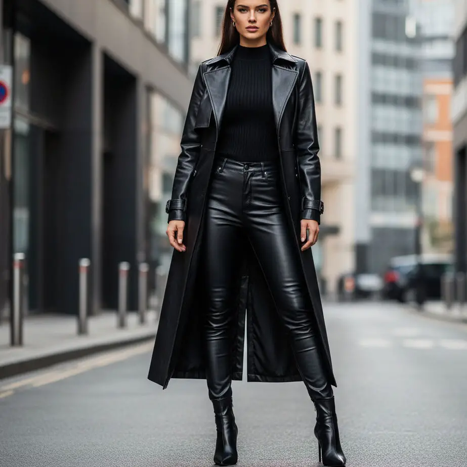 Match a leather trench coat outfit with black leather pants and a ribbed mock-neck top. Add stiletto boots for a power-dressing moment that commands attention.