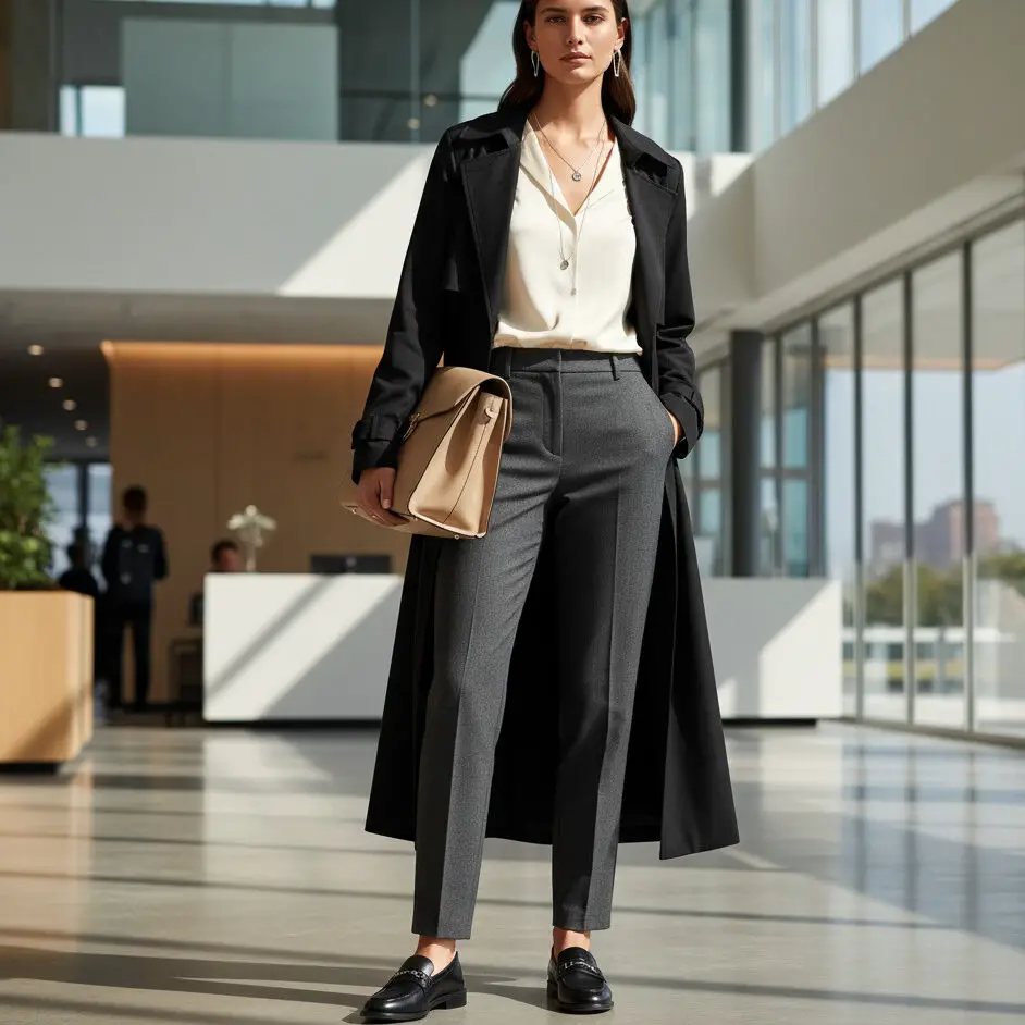 A black trench coat outfit styled with a silk blouse, cigarette pants, and loafers is ideal for the office. Add a neutral tote and delicate jewelry for understated sophistication.