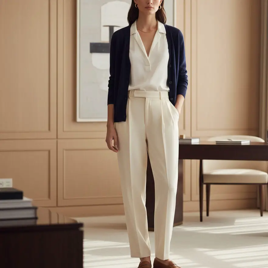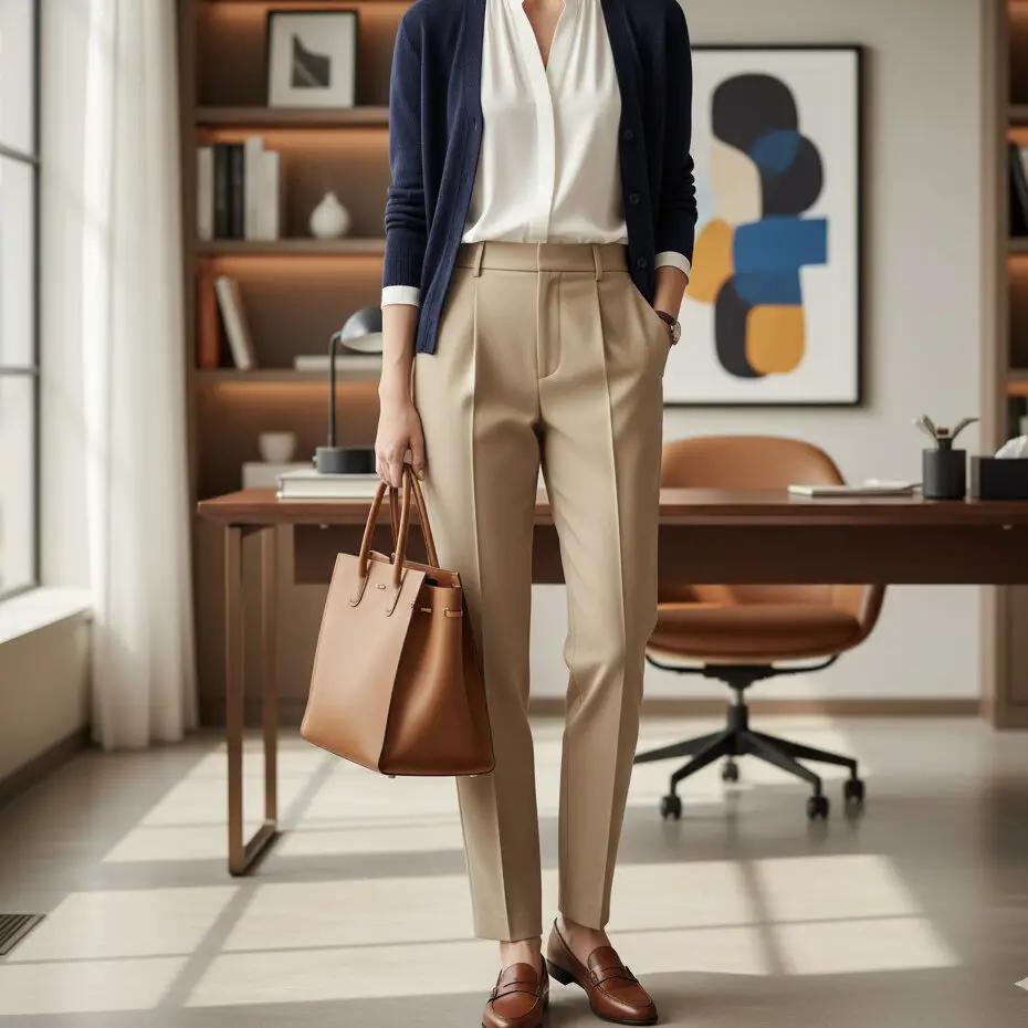 Wear a navy blue cardigan with a white blouse and tailored beige pants. Add loafers and a tote for a subtle old money outfit that transitions effortlessly from office to after-hours.