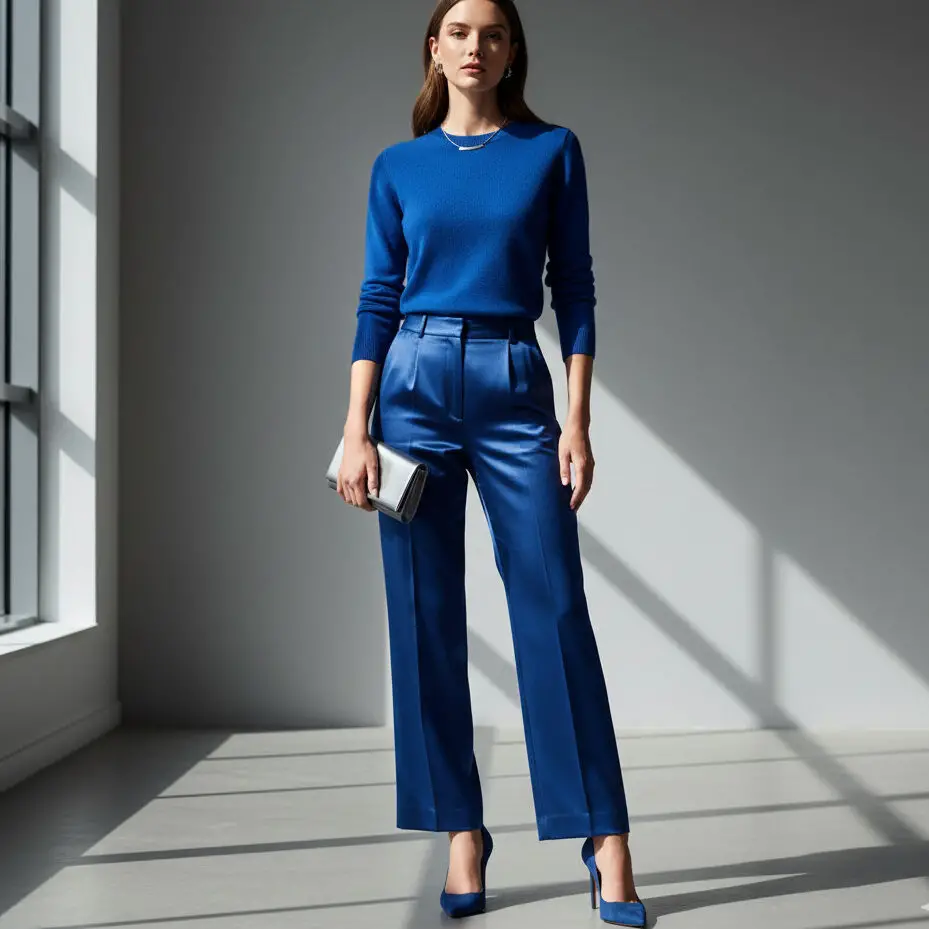 Pair a blue sweater outfit with matching trousers or a satin skirt. Add pointed heels and a silver clutch — a modern, monochromatic look that stands out beautifully.