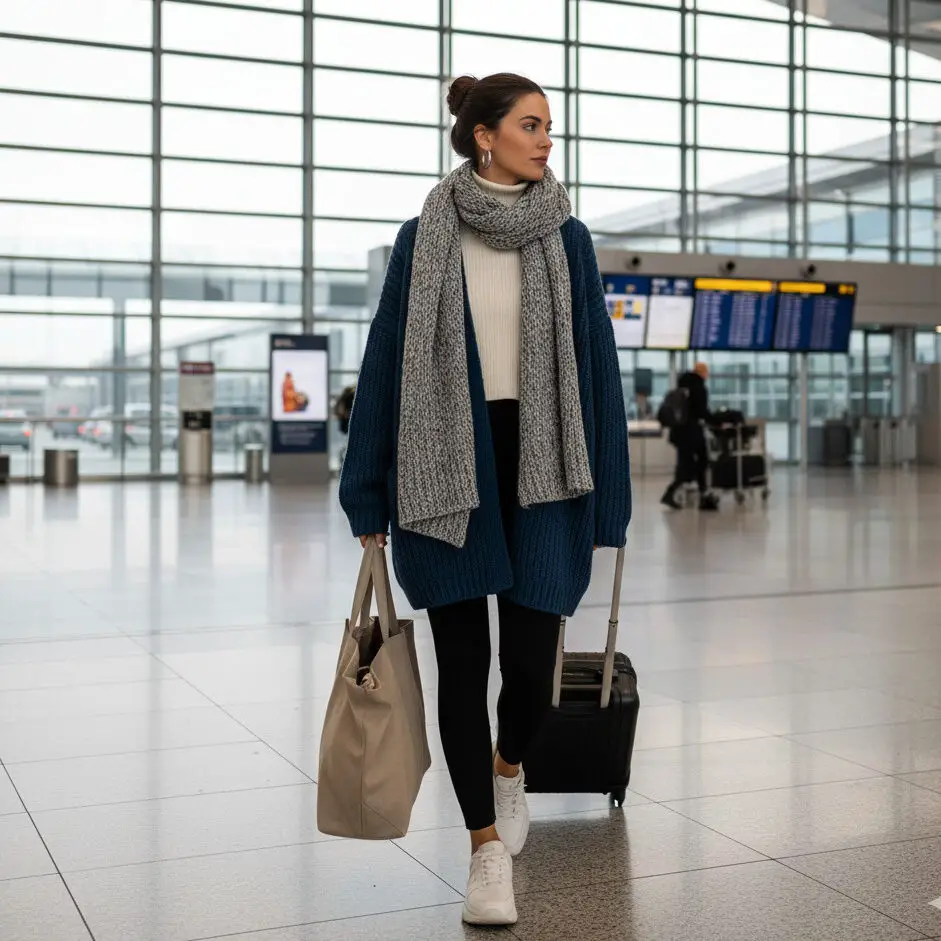 For travel days, wear a winter cardigan outfit with leggings, a turtleneck, and a chunky scarf. Add sneakers and a tote bag for a cozy yet elevated airport-ready style.