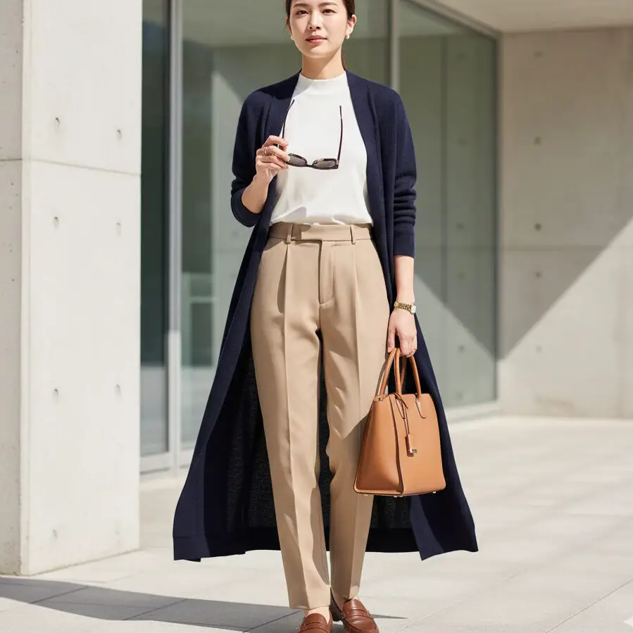 Combine a navy blue outfit with a long cardigan, beige trousers, and a crisp white top. Add loafers and sunglasses — timeless, minimal, and effortlessly elegant.
