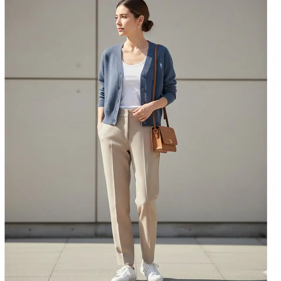 Pair a slate blue cardigan outfit with neutral beige pants and white sneakers. Add a tan crossbody and sleek bun for that minimalist, model-off-duty energy.