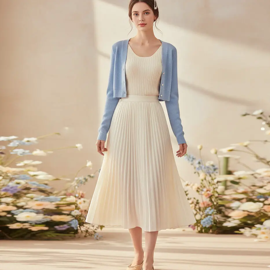 Pair a baby blue outfit with a cropped cardigan, cream tank, and pleated midi skirt. Add ballet flats and a pearl hair clip for a dreamy, soft-feminine aesthetic that’s trending everywhere.