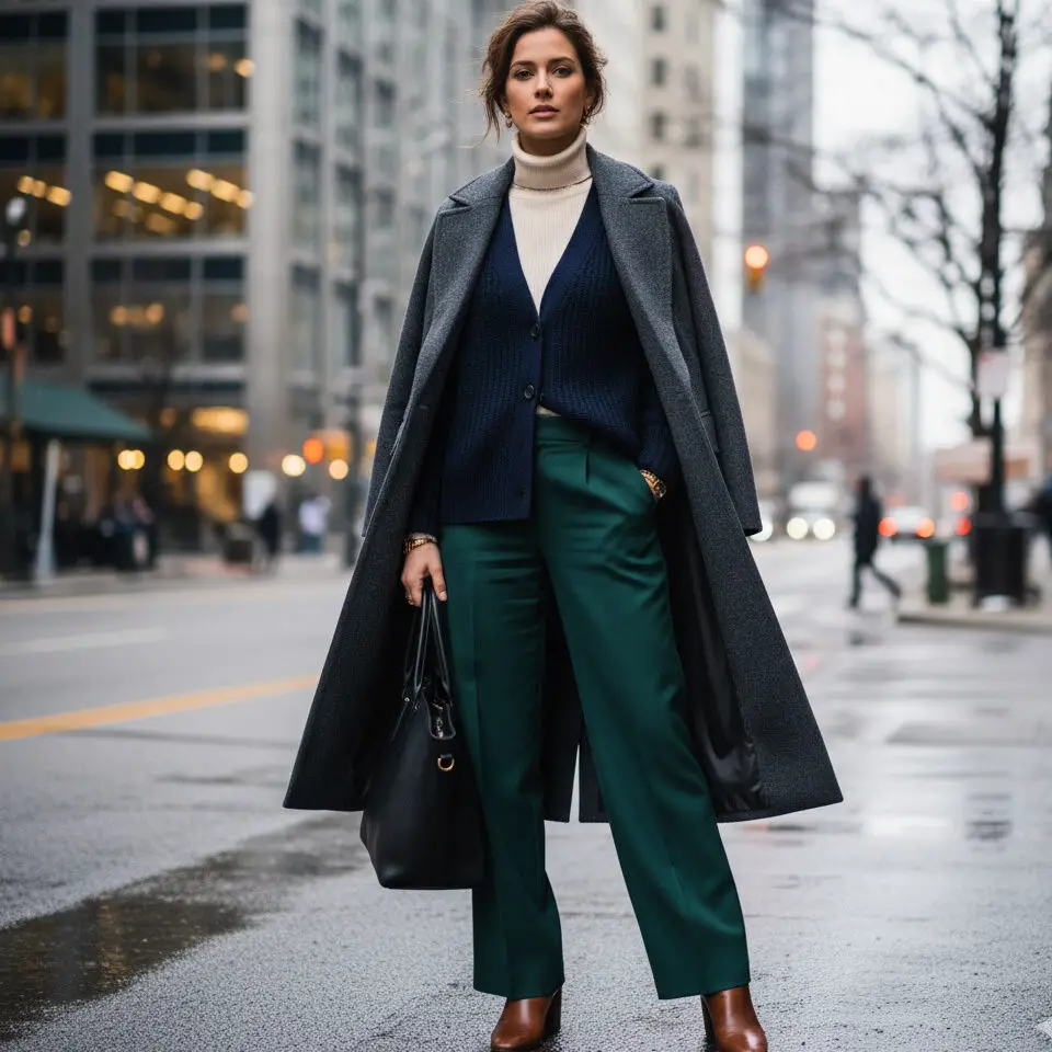 For a winter cardigan outfit, layer your navy cardigan over a turtleneck and wide-leg trousers. Add heeled boots and a structured coat — a polished cold-weather look with cozy luxury.