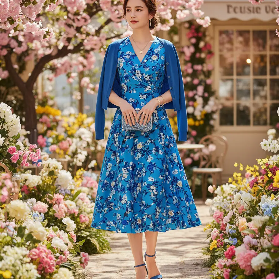 Pair a blue dress with cardigan and nude heels for a brunch-ready ensemble. Add a small clutch and delicate jewelry — elegant, soft, and perfect for spring days or garden parties.
