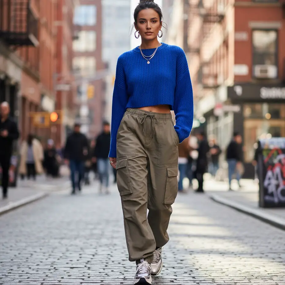 Go casual with a cropped blue sweater outfit and cargo pants. Add chunky sneakers and hoop earrings for a comfy, cool vibe — ideal for a stroll or Sunday errands.