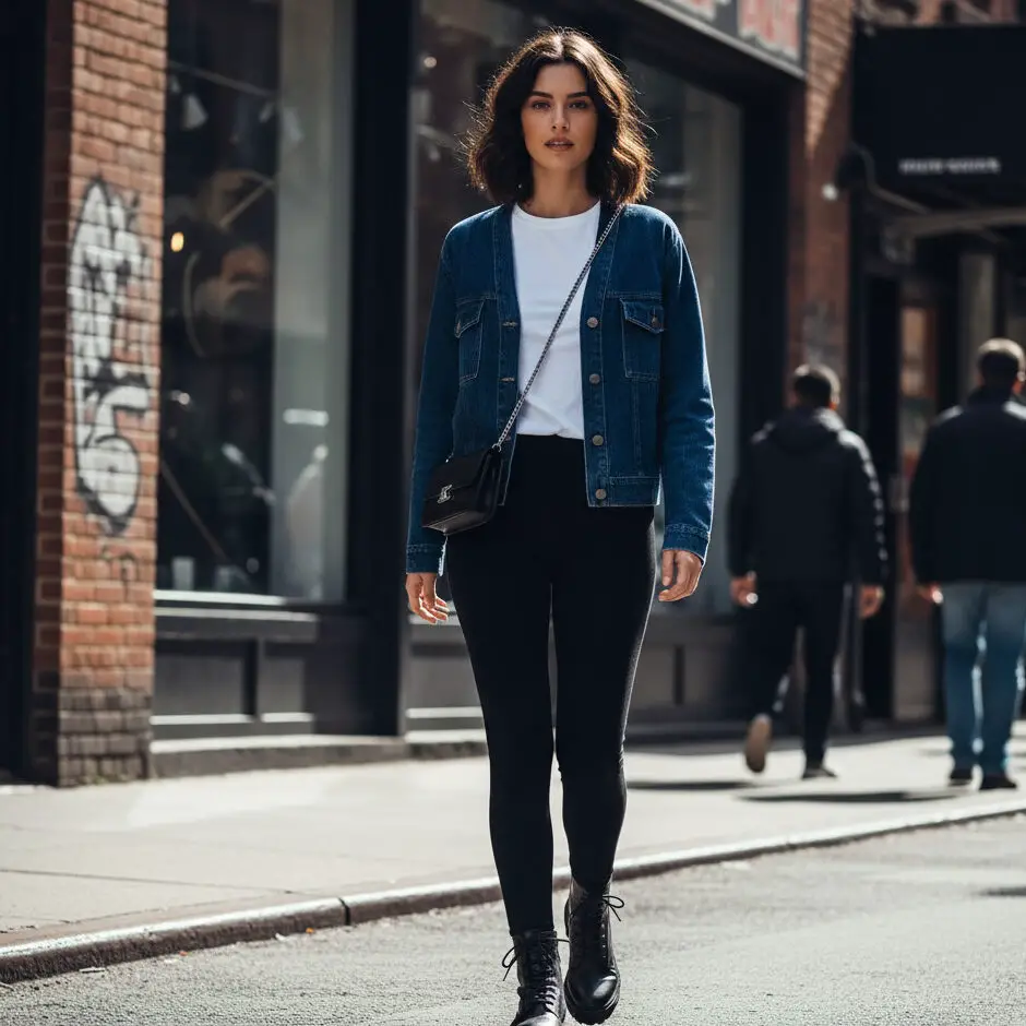 Try a denim cardigan outfit with black leggings and a simple tee. Add combat boots and a crossbody bag for a laid-back, edgy touch that’s still effortlessly chic.