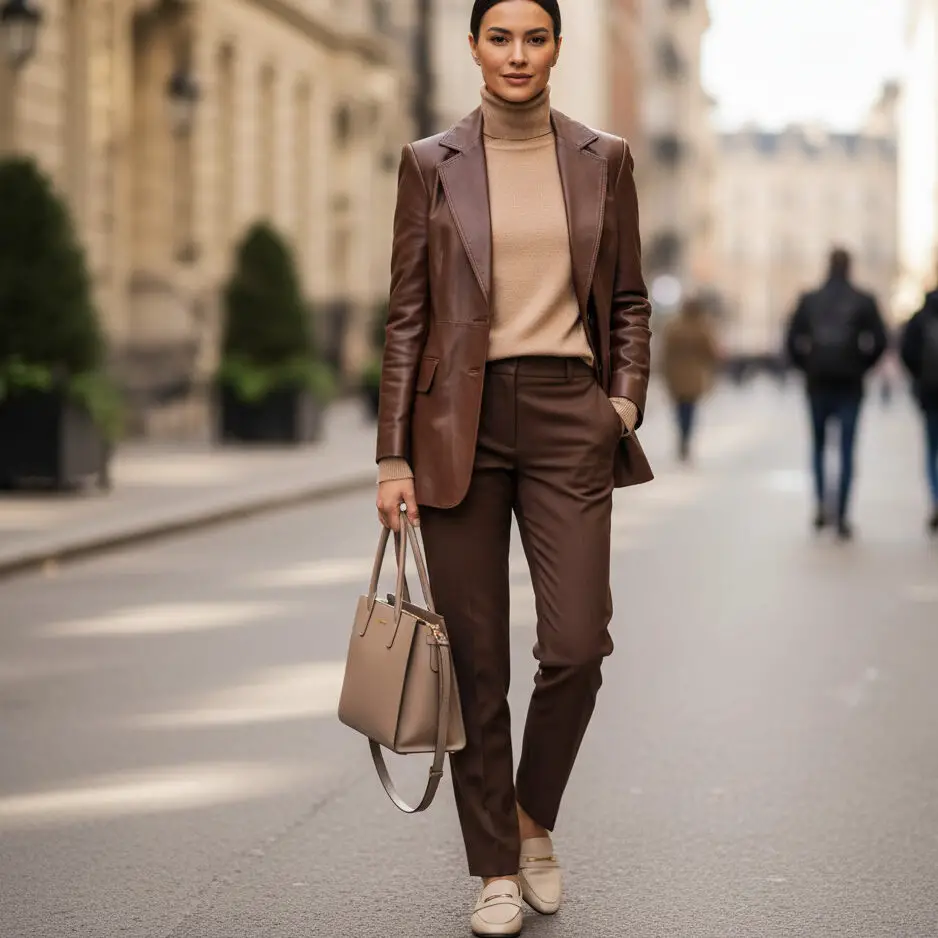 Opt for a chocolate brown leather blazer outfit over a beige turtleneck and matching trousers. Neutral loafers and a sleek tote create a polished city-girl vibe.