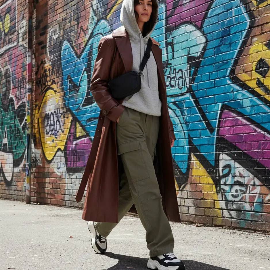 For an edgy trench coat styling, layer a brown leather coat outfit with a hoodie, cargo pants, and chunky sneakers. Add a baseball cap for cool-girl attitude.