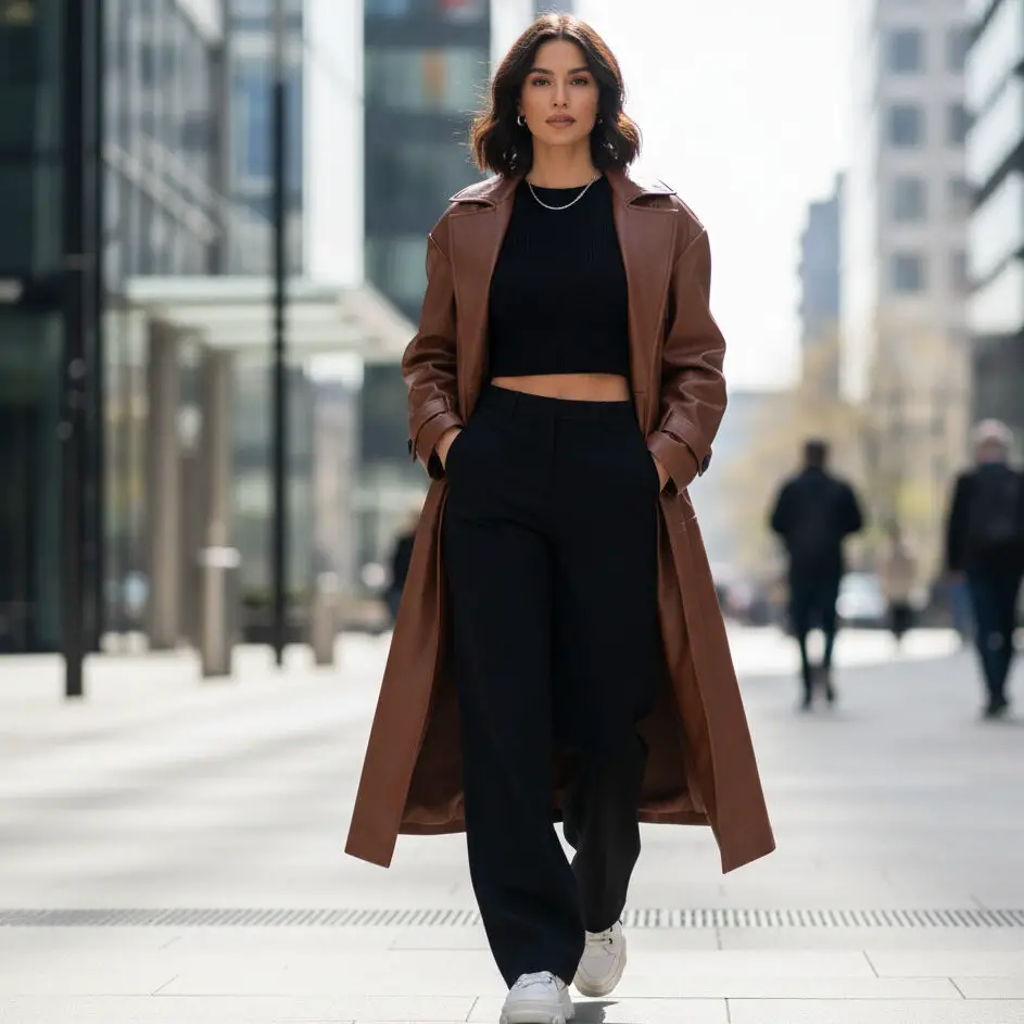Style your chocolate brown coat outfit with a black crop top, high-waisted trousers, and platform sneakers. Add sleek shades for a confident, city-girl edge.