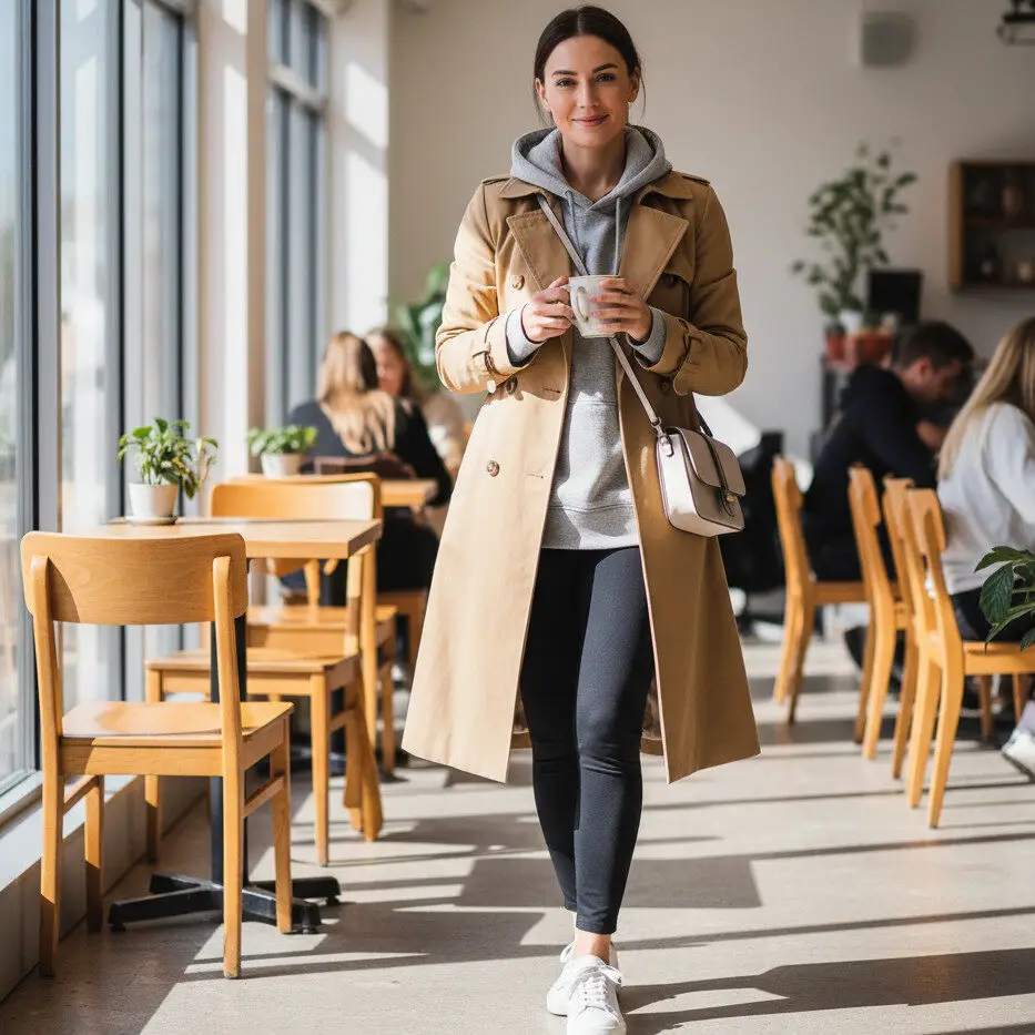 Throw on a tan trench coat outfit with leggings, a hoodie, and sneakers. A tote bag and messy bun make this look effortlessly street-style approved.