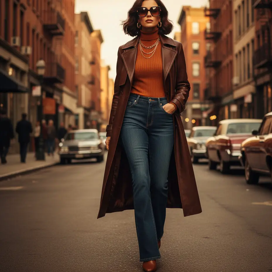 Channel old-school glam with a dark brown coat outfit and flared jeans. Add a fitted turtleneck, block heels, and oversized sunglasses for that ’70s-inspired twist.