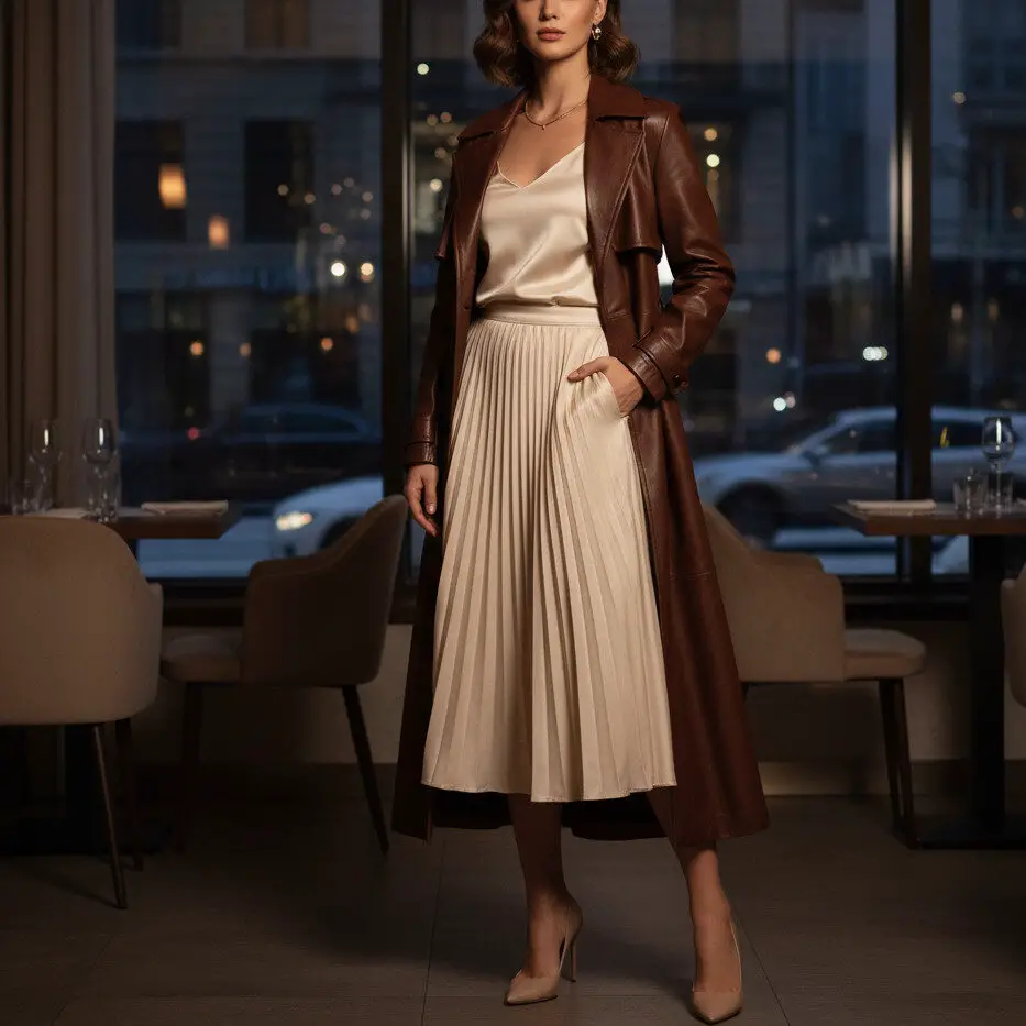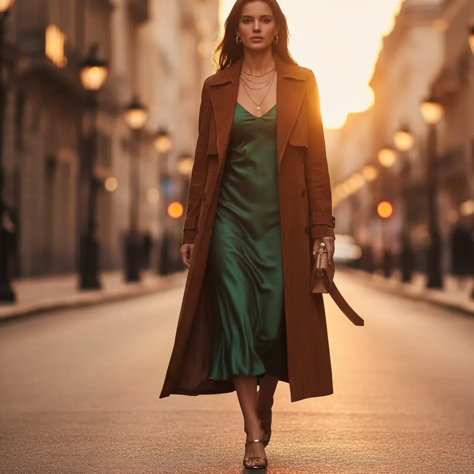 Opt for suede trench coat outfits paired with a satin slip dress and heeled mules. Add dainty gold jewelry for a refined, soft-textured evening ensemble.