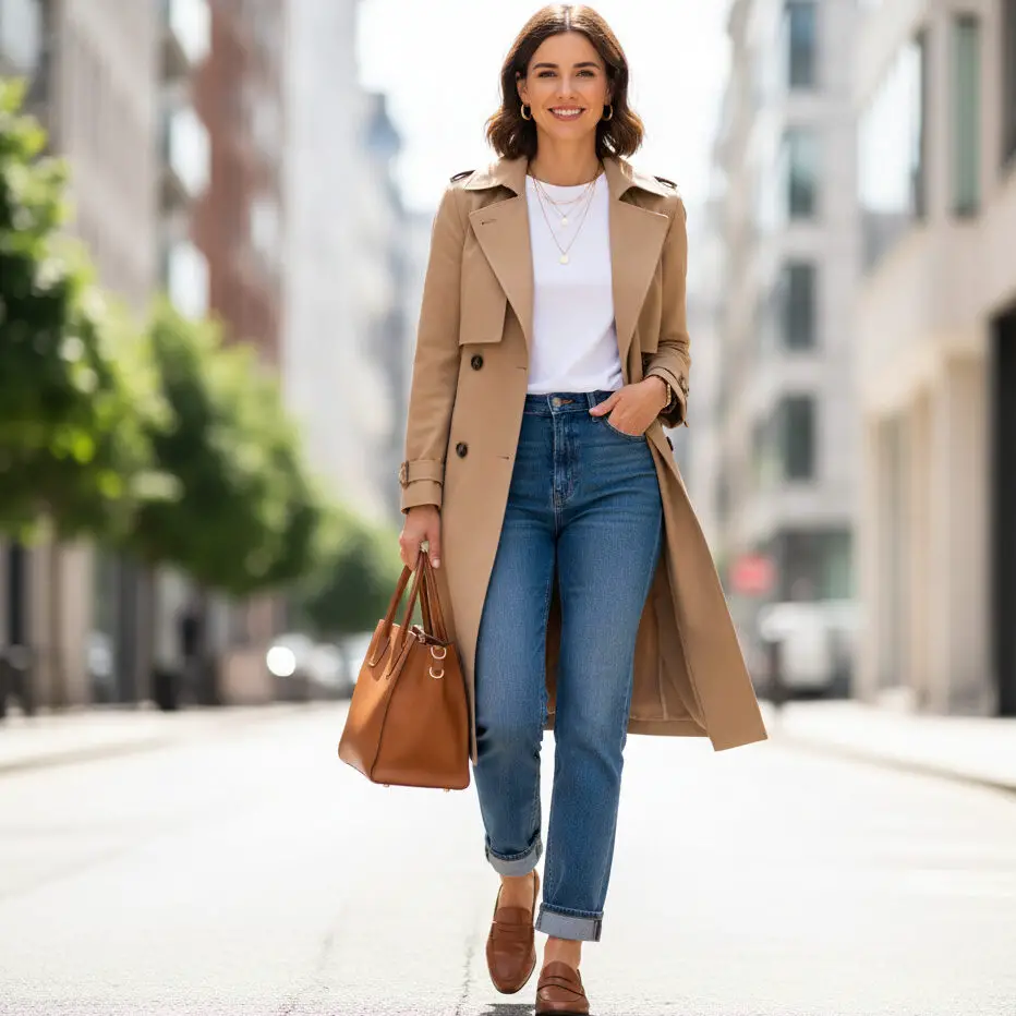 Pair a tan trench coat outfit with a white tee, blue straight jeans, and loafers. Add a structured tote and gold hoops for that effortless street-style look perfect for fall walks.
