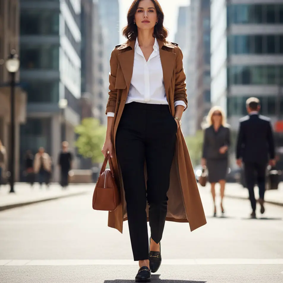 Wear your brown trench coat outfit over a button-down shirt, cigarette pants, and loafers. A leather tote and sleek bun elevate this for a smart weekday finish.