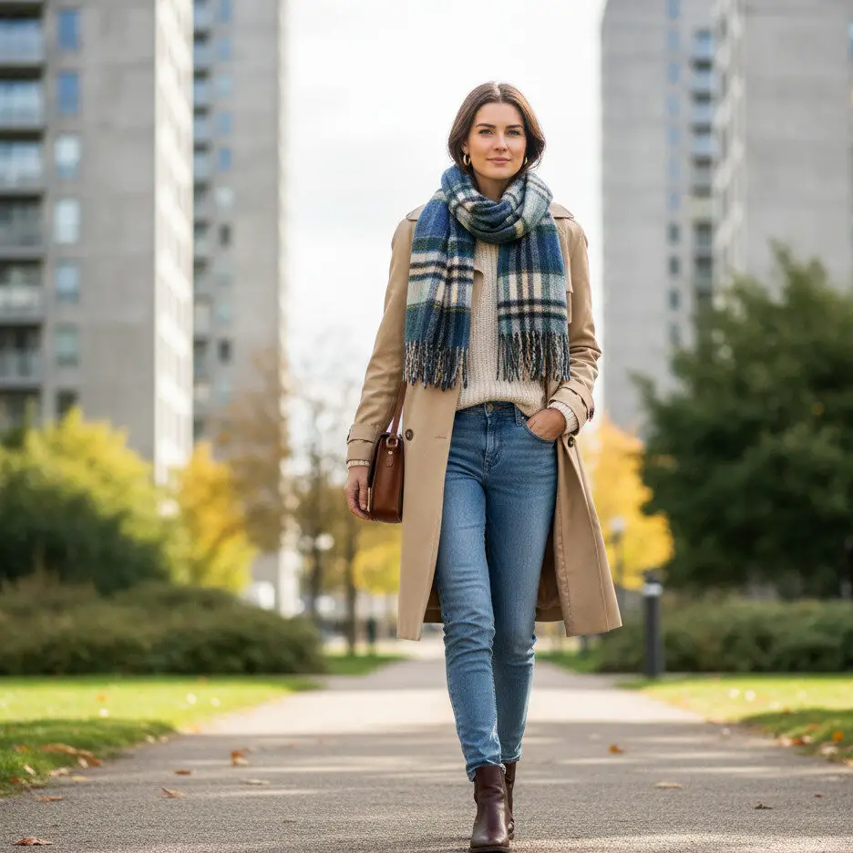 Combine a beige trench coat outfit with a plaid scarf, light sweater, and slim jeans. Add Chelsea boots for a cozy yet chic look that fits any weekend plan.