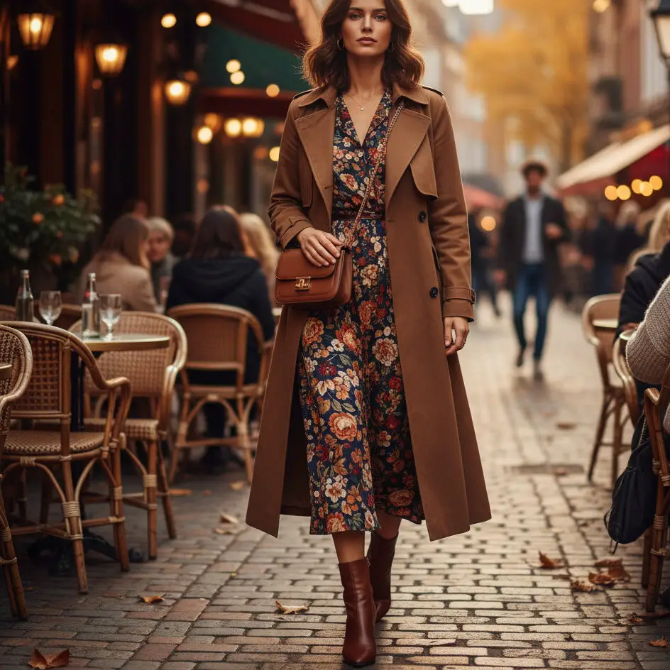 A trench coat outfit fall combo — pair your brown trench with a floral midi dress and ankle boots. A crossbody bag adds just the right touch of charm.