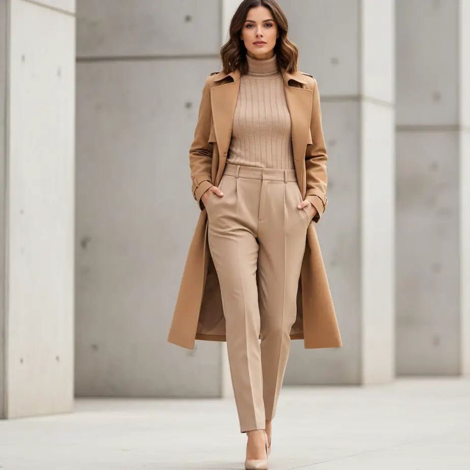 Try a camel trench coat outfit with a beige turtleneck and tailored trousers. Complete the neutral look and a minimalist crossbody — understated luxury in motion.
