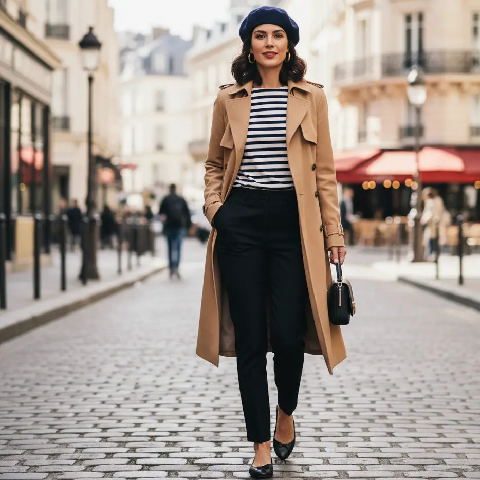 Wear a camel trench coat outfit over a striped Breton top, black cigarette pants, and ballet flats. Add a beret for an instantly chic Parisian flair.