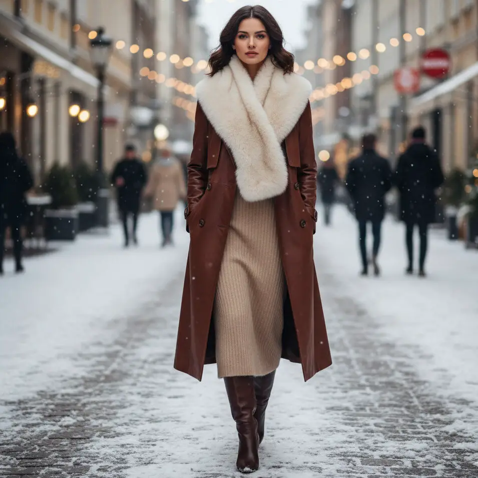 Layer a brown coat outfit winter with a faux-fur scarf, knit dress, and knee-high boots. Add a clutch and bold lip for cozy sophistication on frosty days.