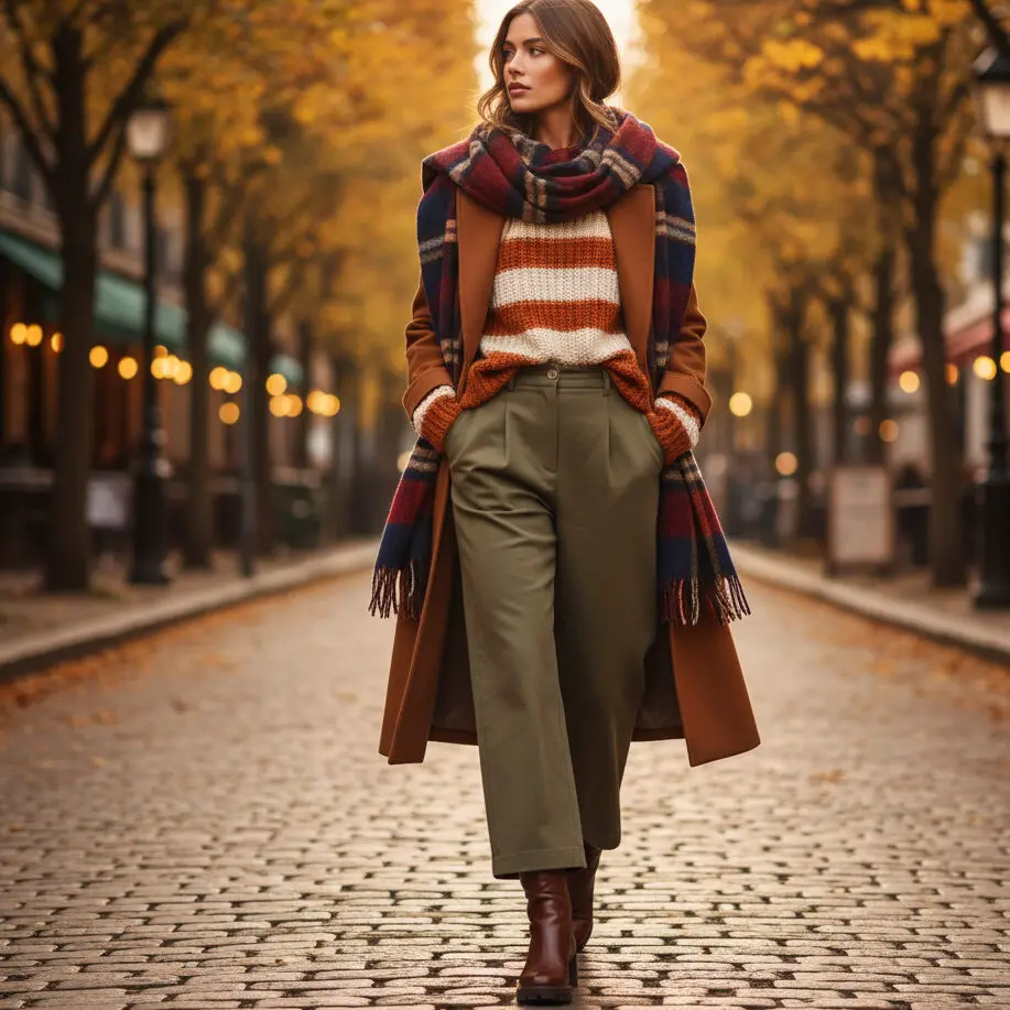 Create fall trench coat outfits by combining a striped knit sweater, high-waist trousers, and boots. Add a plaid scarf for cozy, autumnal flair.
