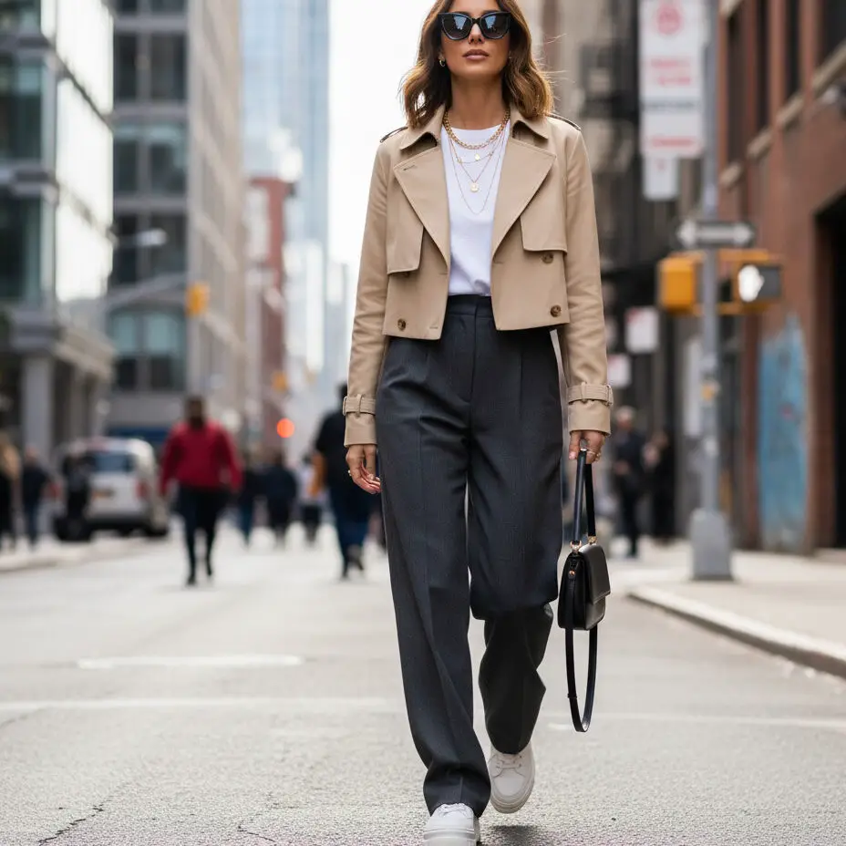Combine a cropped trench with wide-leg trousers, a basic tee, and sneakers. Add layered necklaces for that influencer-inspired trench coat looks aesthetic.