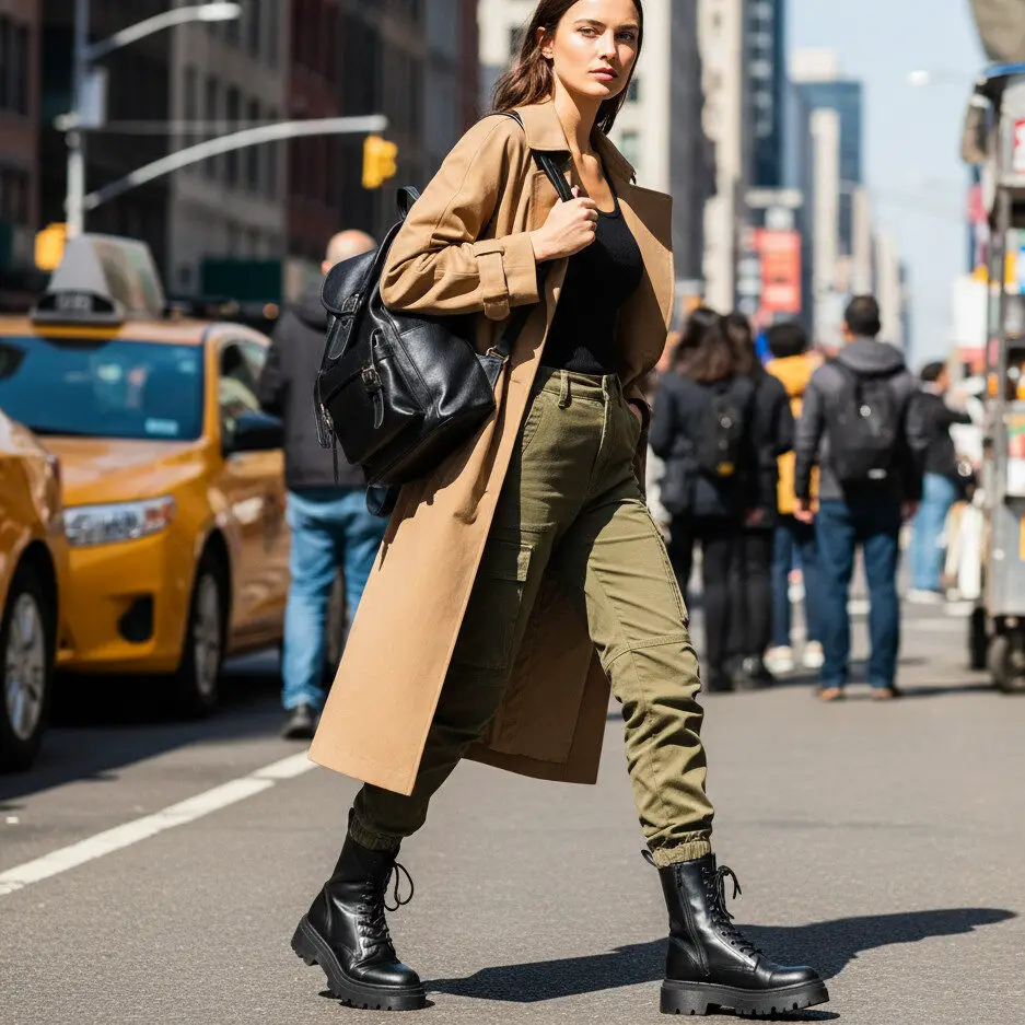 Style your trench coat fits with cargo pants, a ribbed tank, and combat boots. A leather backpack completes the adventurous city look.