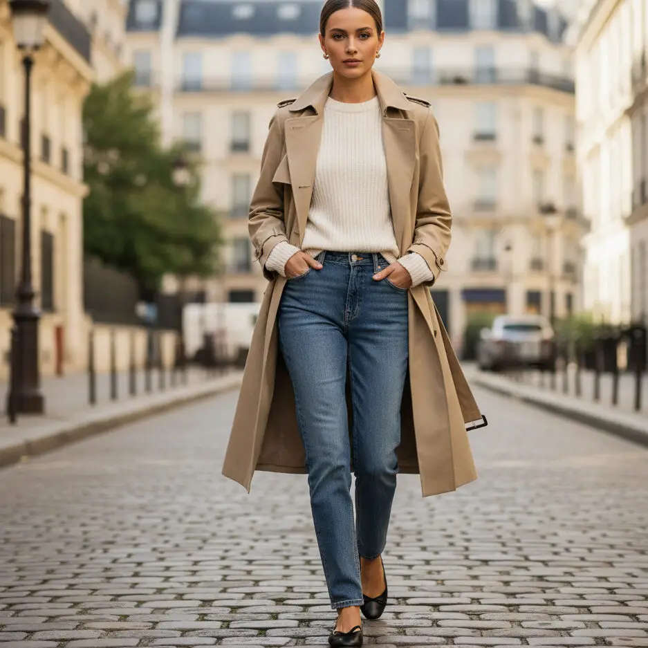 Channel old money outfits energy with a beige trench, cream sweater, and straight jeans. Ballet flats and a sleek bun add that chic French twist.
