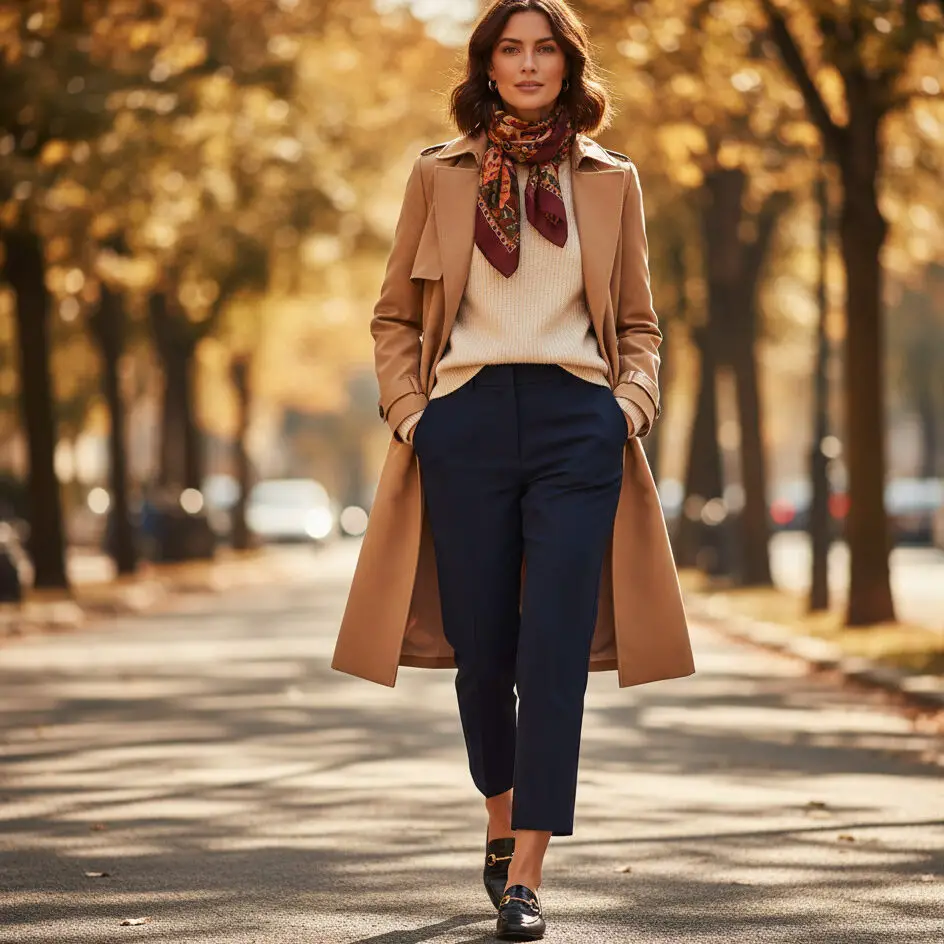 For mid-season style, layer your fall trench coat outfits with a light sweater, cropped trousers, and loafers. A printed scarf ties the look together beautifully.