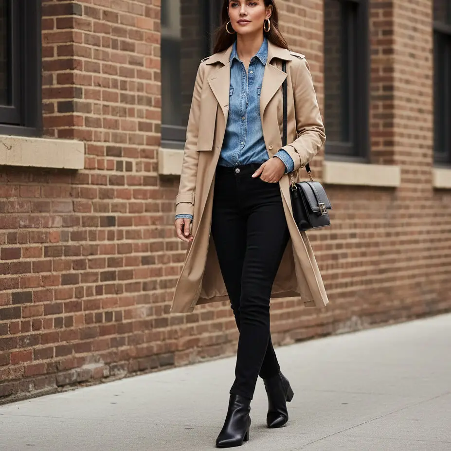 A casual trench coat outfit layered over a denim shirt, black jeans, and ankle boots is timeless. Gold hoops and a crossbody polish the look effortlessly.