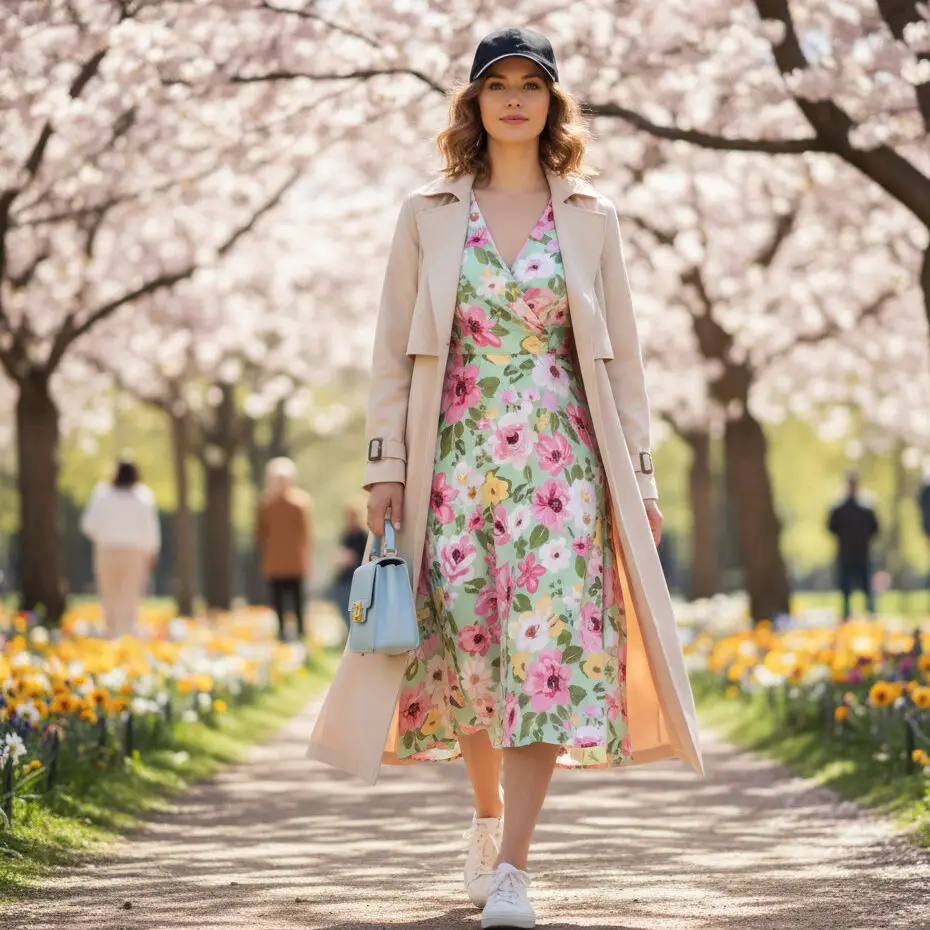 Try a spring trench coat outfit with a floral midi dress and low-top sneakers. A pastel handbag adds color, keeping the outfit light and breezy for warmer days.