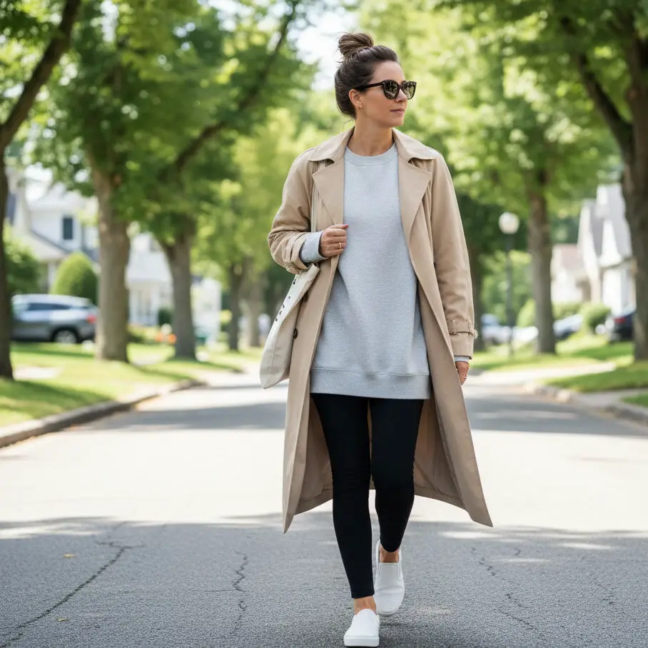 A casual trench coat outfit works perfectly with leggings, an oversized sweatshirt, and slip-on sneakers. Add a messy bun for an effortless finish.
