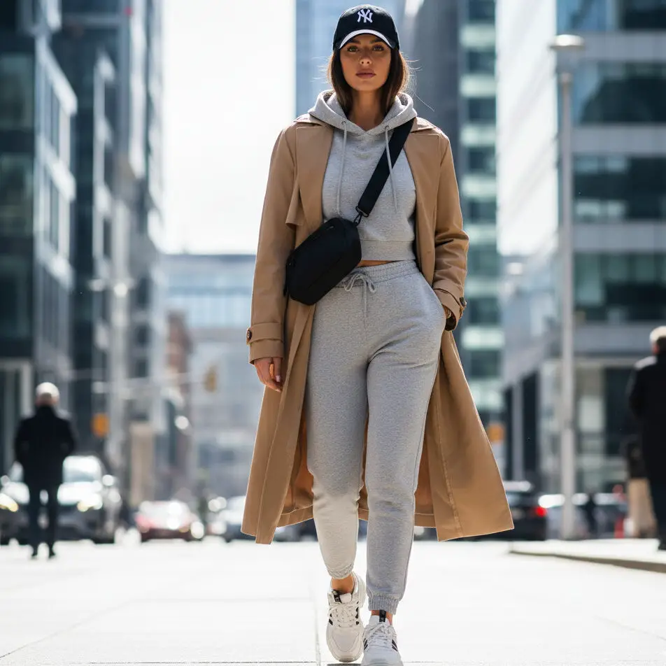 Layer your trench coat outfit street style with a cropped hoodie, joggers, and chunky sneakers. Add a baseball cap for the perfect off-duty, city-ready ensemble.