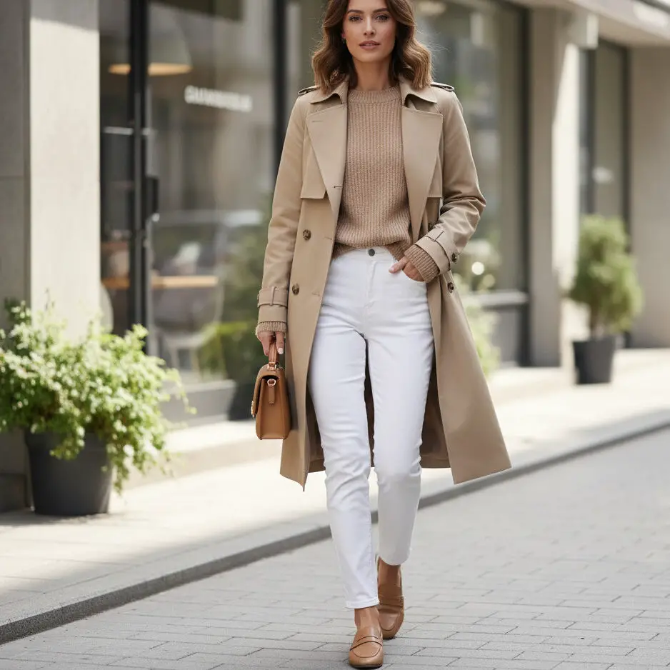 Wear a beige trench coat outfit with a beige sweater, white jeans, and tan loafers. A small satchel bag adds a refined, casual charm.