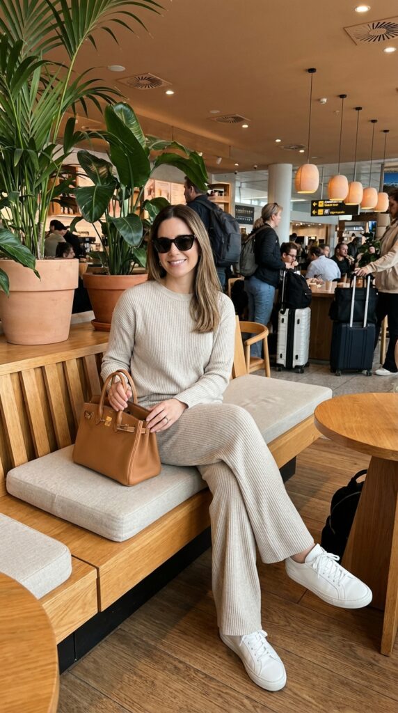 A coordinated knit top and pants set delivers instant polish. Style it with sleek sneakers, a structured handbag, and sunglasses for one of the easiest chic travel looks that feels cozy yet elevated.
