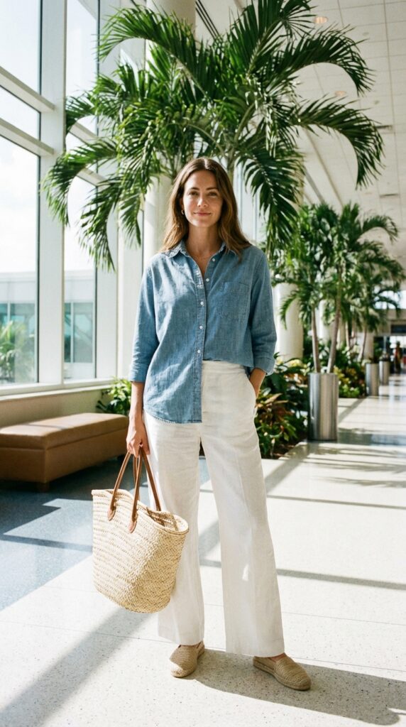 A chambray shirt styled with white pants feels fresh and summery. Complete the look with espadrilles and a straw tote for effortless summer travel fashion that’s both practical and chic.
