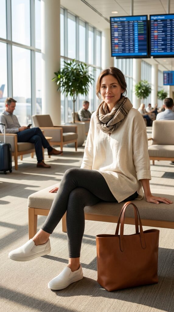 A flowy tunic over high-quality leggings offers comfort for long flights. Add slip-on sneakers, a scarf, and a large tote for a dependable comfortable airport outfit that still feels polished.