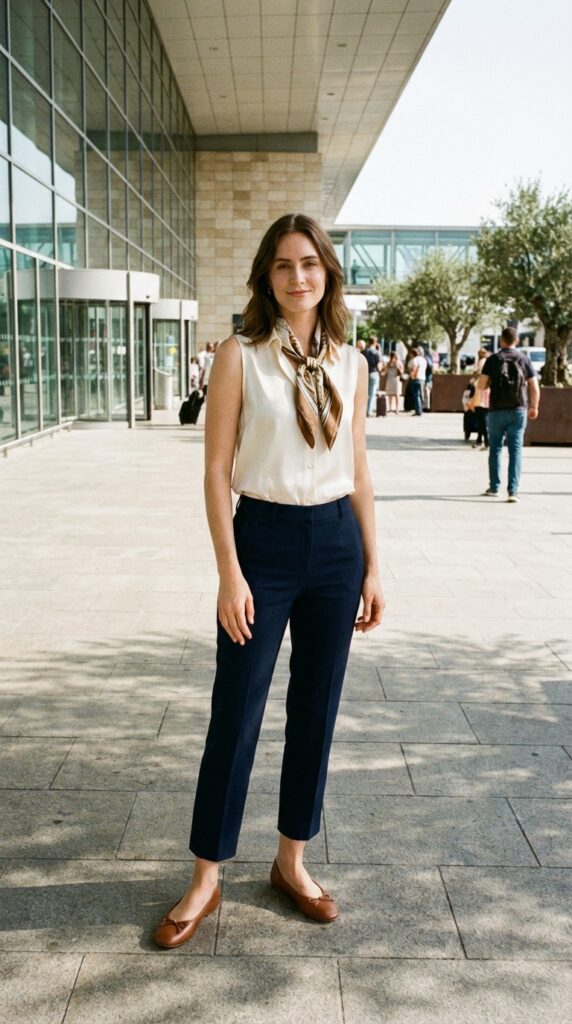 A sleeveless blouse with tailored cropped trousers is perfect for warm travel days. Pair with ballet flats and a silk scarf for a refined, breathable comfortable airport outfit with a touch of elegance.