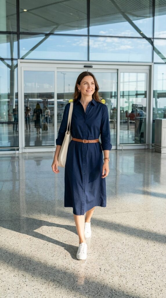 A structured shirt dress styled with clean white sneakers offers effortless polish. Add a belt, tote bag, and minimal accessories for a refined yet comfortable airport outfit perfect for summer travel.