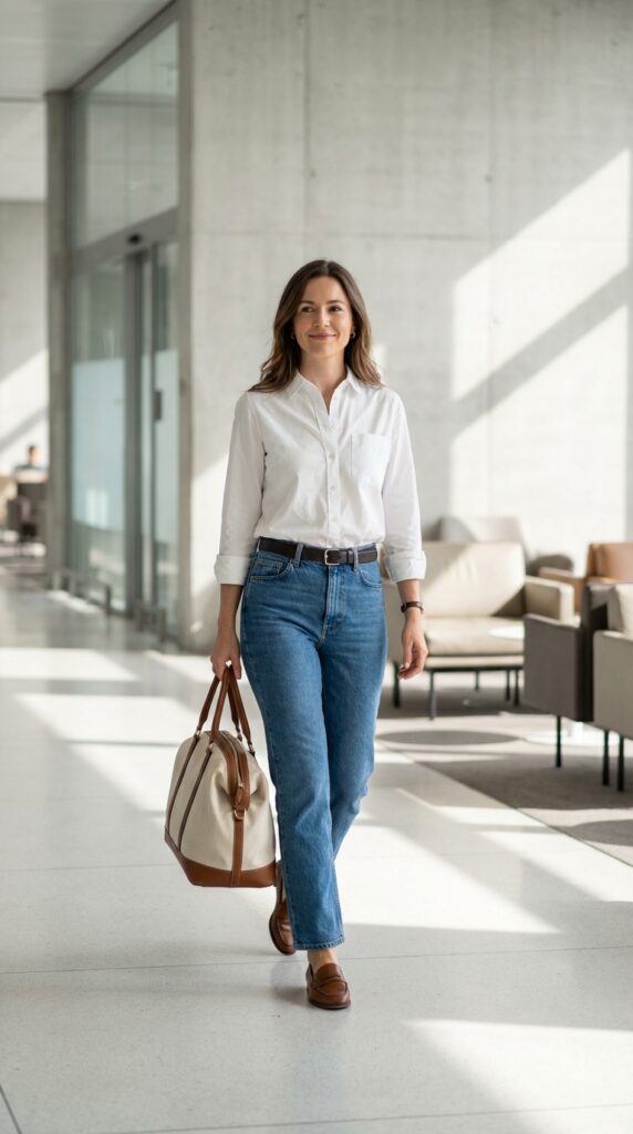 A classic white shirt tucked into straight-leg denim creates a timeless airport look. Add loafers, a belt, and a carry-on tote for a clean, airport style over 40 that never goes out of fashion.