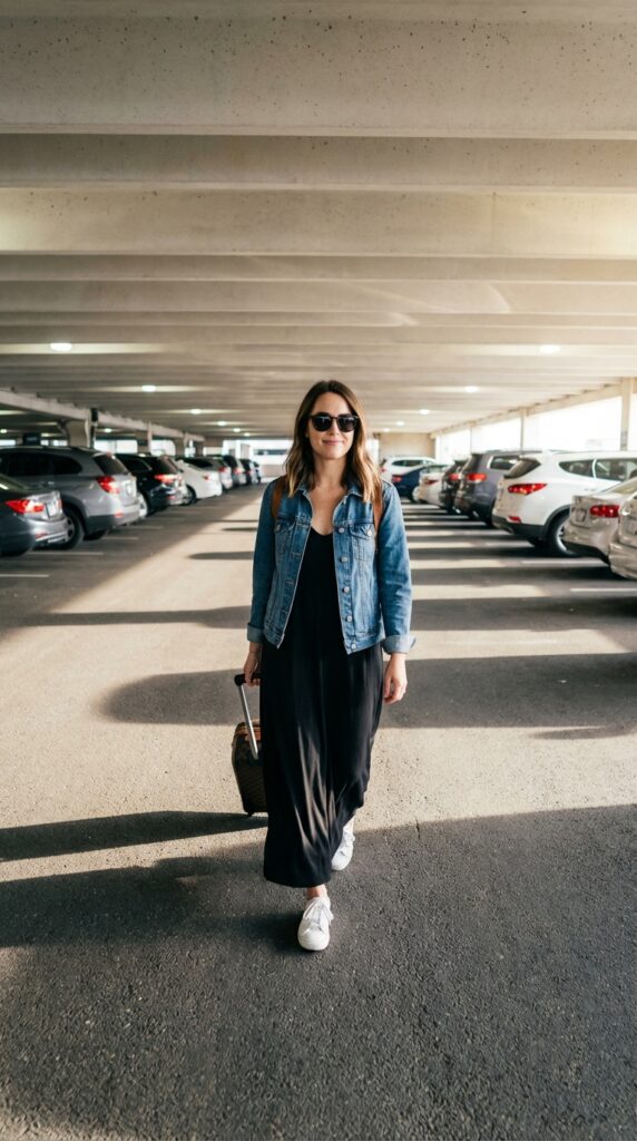 Layer a classic denim jacket over a black maxi dress for a versatile travel outfit. Add sneakers and sunglasses—this stylish travel outfit for women 40+ works across temperatures and settings.