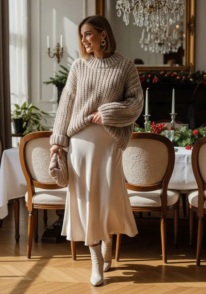 This Cozy Christmas Dinner Outfit Ideas look pairs an oversized knit sweater with a flowing satin midi skirt.