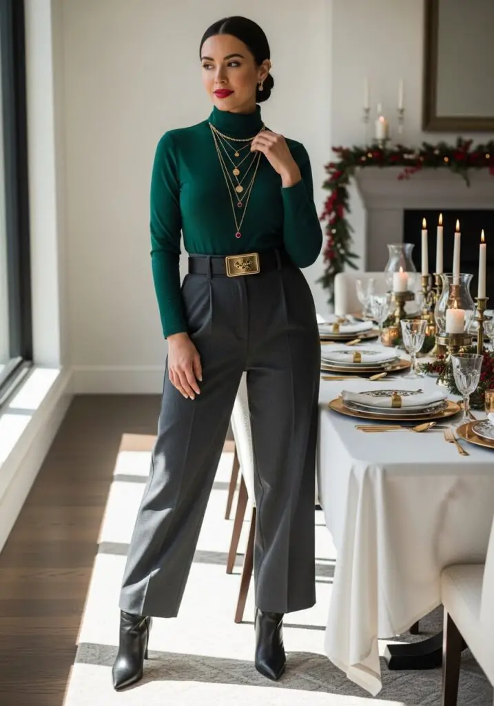 A polished Christmas Dinner Outfit built around a fitted turtleneck and wide-leg trousers.