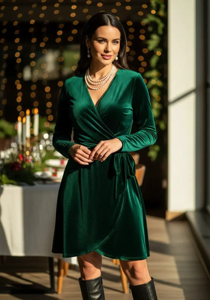 3. Velvet Wrap Dress With Ankle Boots