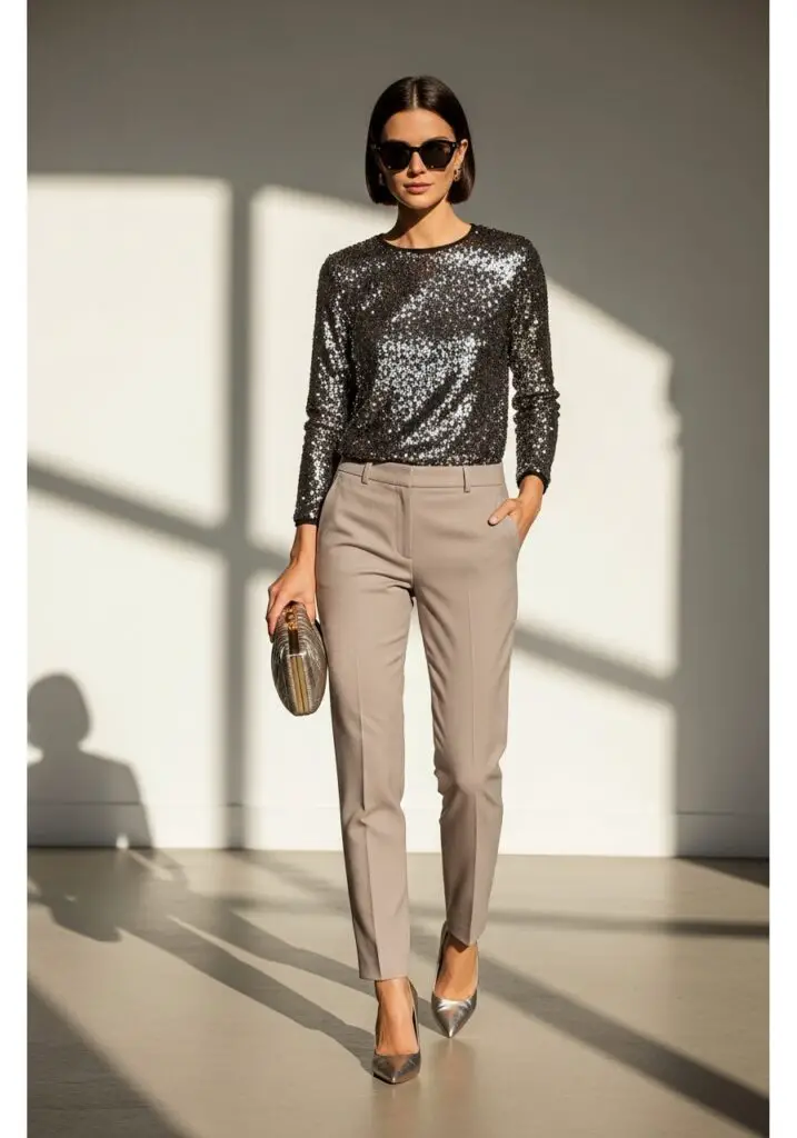 A subtle festive touch with a sequin top balanced by neutral trousers.