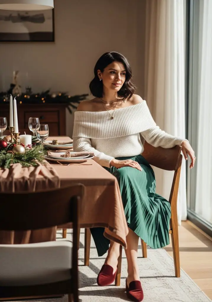 Soft layering defines this Cozy Christmas Dinner Outfit Ideas combination.