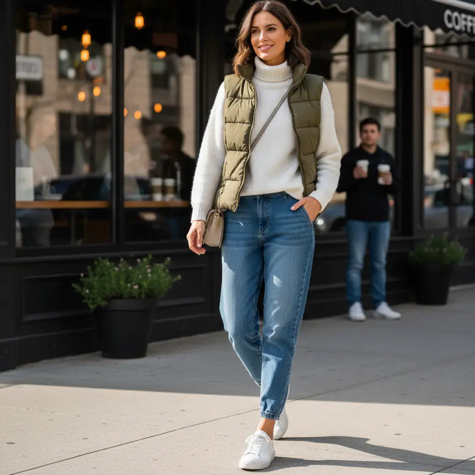 Wear your white turtleneck sweater with denim pants and sneakers. Add a puffer vest for warmth and style. A relaxed turtle neck outfit winter combo for coffee dates or errands.
